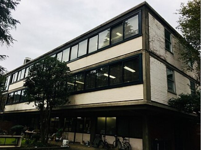 B1F〜3F RC造です。コルビュジエの「新しい建築の5原則」のうち、“ピロティ”、“自由な平面”、“自由な立面”、“独立骨組みによる水平連続窓”、までを忠実に守った建築だった。ただ5番目“屋上庭園”は不要と考えたのだろう。前川國男事務所設計室は3Fにありました。内外装RC打ち放しですから暑かったです。屋上に水を張って断熱を試みましたがむしろ漏水が問題になってしまいました。鋼製建具(普通鉄)だったのでシャープなデザインで格好良かったのですが開け閉めには苦労しました。
